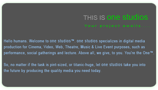 Attention!!! one studios is currently undergoing heavy renovations and will continue to be improved over the coming months. Be ready for a totally new site, with a ton more media and a completely original directory that will point you in the direction of other sites that are part of the one studios family! A much more interactive ?